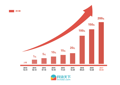 截止2017年4月4日,民贷天下累计成交额突破200亿,服务用户人数已超过338万。从只有20多人的创业公司发展成如今拥有400多名员工、10多家分公司以及两大研发中心的互联网金融科技领先企业,民贷天下只用了两年零三个月,就迈入了“200亿”时代。